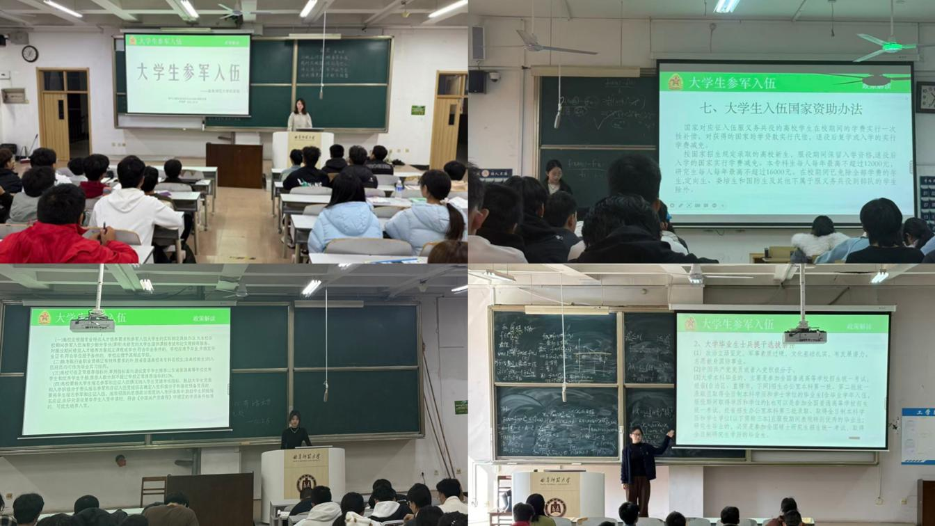 为激发青年学子的家国情怀与责任担当,鼓励更多优秀大学生携笔从戎、投身国防事业,10月24日,工学院以班级为单位举办征兵入伍政策宣讲活动。本次活动由学院团委组织,面向全体本科生开展,旨在全面解读最新征兵政策,点燃青年参军报国的热情。