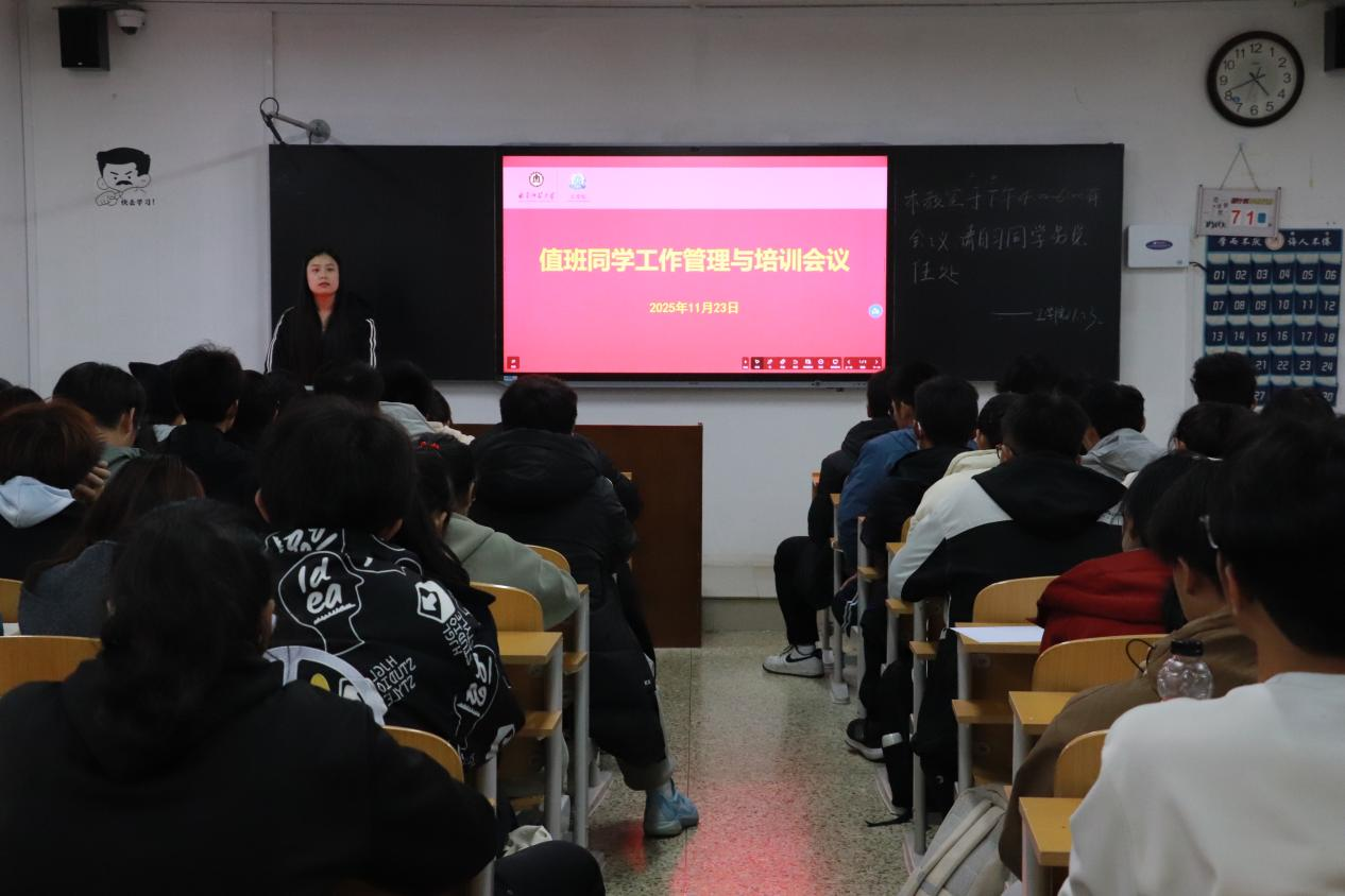 在值班干部管理与培训方面,赵健强调需注意保持办公室整体环境整洁,并着力整顿当前值班工作中存在的“到岗不到位、履职不主动”等突出问题。会议进一步强调值班职责须落实到位,要求值班同学主动对接教师需求、及时完成任务,做好卫生清洁与物资整理,特殊情况提前报备并安排替班;严格执行交接登记,到岗签到、离岗锁门关灯,钥匙定点存放。此外,会议还提出建立值班工作群管理机制,要求值班同学按流程上传办公室全景等照片,以痕迹化管理确保全程可控、责任可溯。