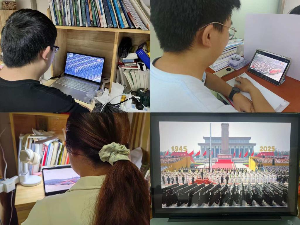 活动中,党支部全体成员各自观看纪念中国人民抗日战争暨世界反法西斯战争胜利80周年阅兵,随着阅兵活动正式开始,整齐划一的受阅方阵、庄严肃穆的纪念仪式、饱含敬意的历史回顾,深深吸引了每一位师生的目光。全体党员跟随直播镜头共同回顾了那一段峥嵘岁月,集体缅怀革命先烈,见证了新时代激昂奋进的强国强军之路。大家全神贯注,不时为画面中展现的国家力量与民族精神所动容,深刻感受到80年前中国人民浴血奋战、抵御外侮的英雄气概,以及如今祖国日益强大的蓬勃生机。